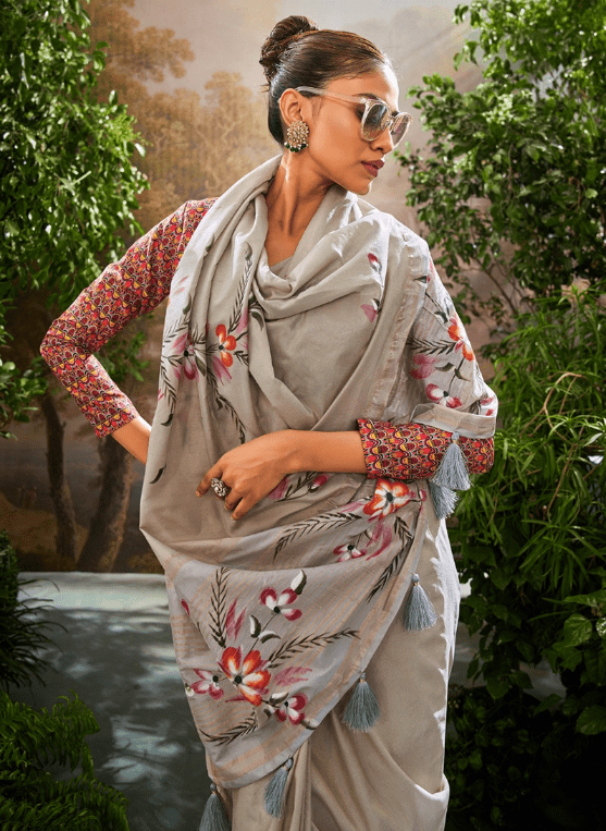 Indulge in the exquisite allure of our Soft Linen Tissue Gray Party Wear Hand Brush Print Saree. This masterpiece is crafted from the finest soft linen tissue, adorned with an intricate hand brush print that shimmers delicately. Its gray hue exudes sophistication and elegance, making it the perfect attire for any festive occasion. The saree’s flowing drape and breathable fabric will keep you comfortable and graceful throughout the evening. Whether attending a wedding, a grand reception, or a formal gathering, this saree will undoubtedly turn heads and elevate your style quotient.