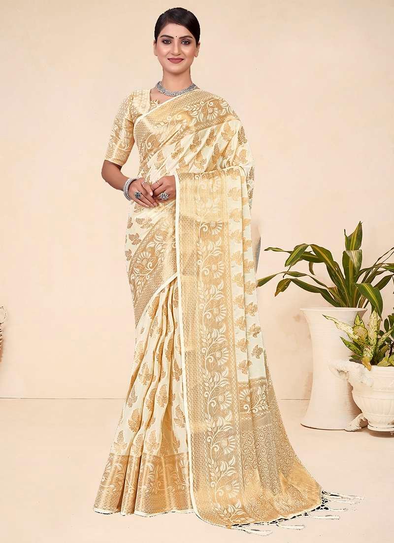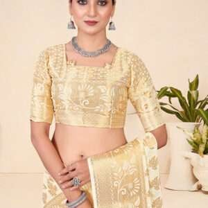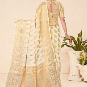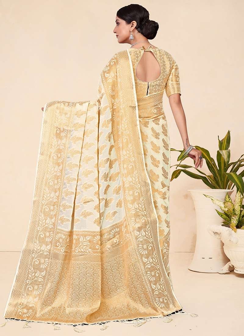 Indulge in the exquisite charm of our Viscose Cream Festival Wear Weaving Saree, crafted from the finest viscose fabric. The saree captivates hearts with its elegant cream hue, enhanced by intricate weaving that adds a touch of sophistication. Perfect for any festive occasion, this attire elevates your style with its alluring beauty. Note that accessories shown in the image are for illustrative purposes and the length may vary slightly. Celebrate the vibrant spirit of festivals in this exquisite creation that combines traditional artistry with modern elegance.