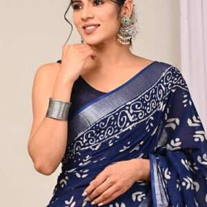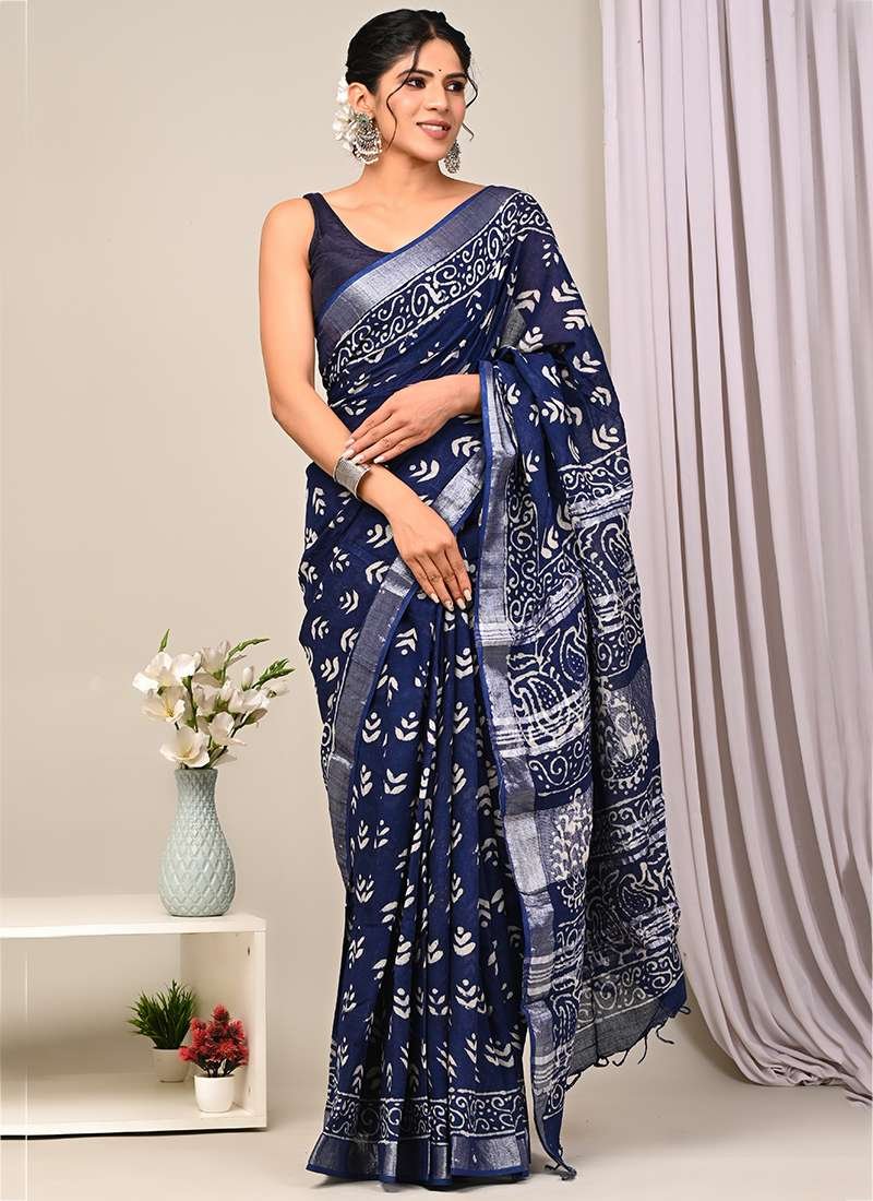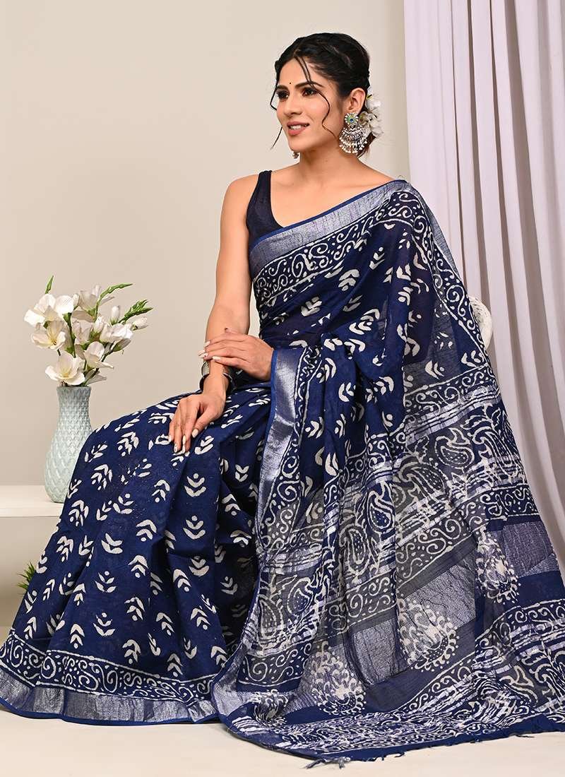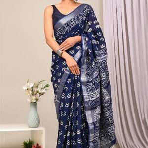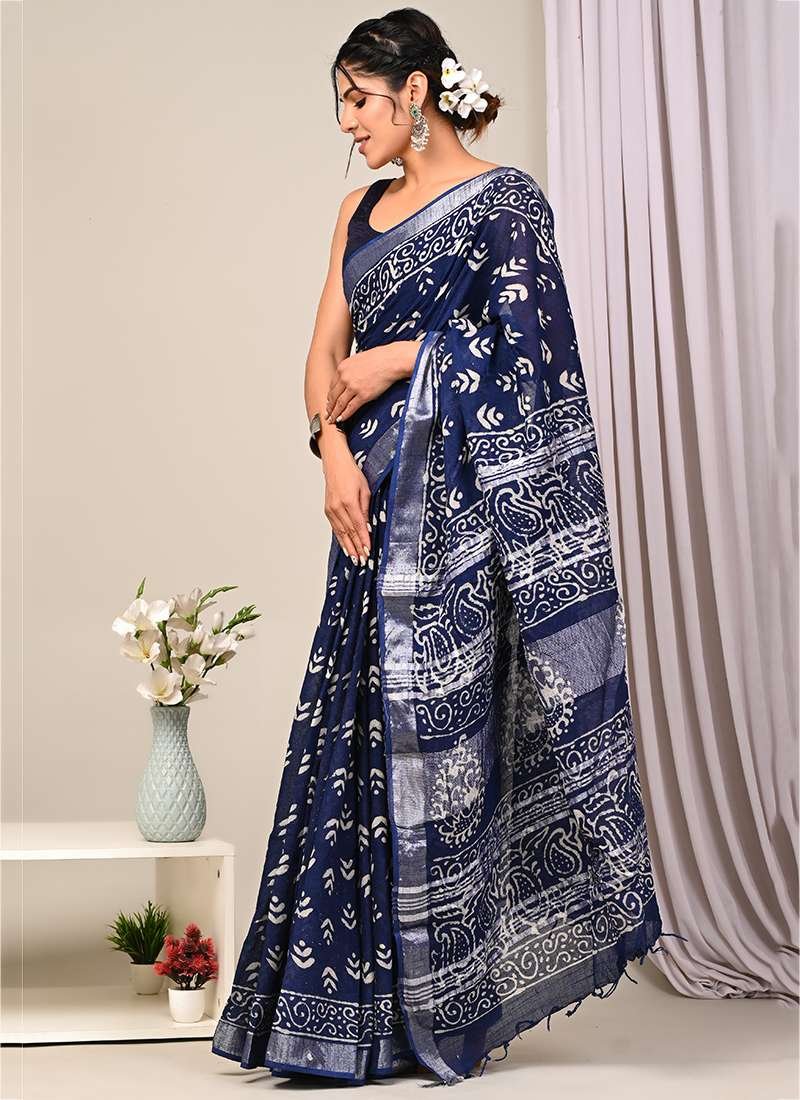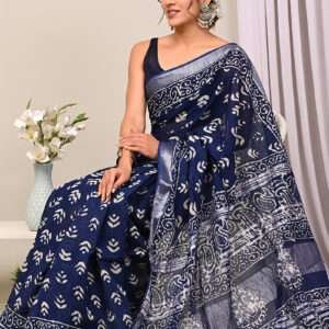 Malhari Navy Blue Linen Cotton Bagru Prited Saree