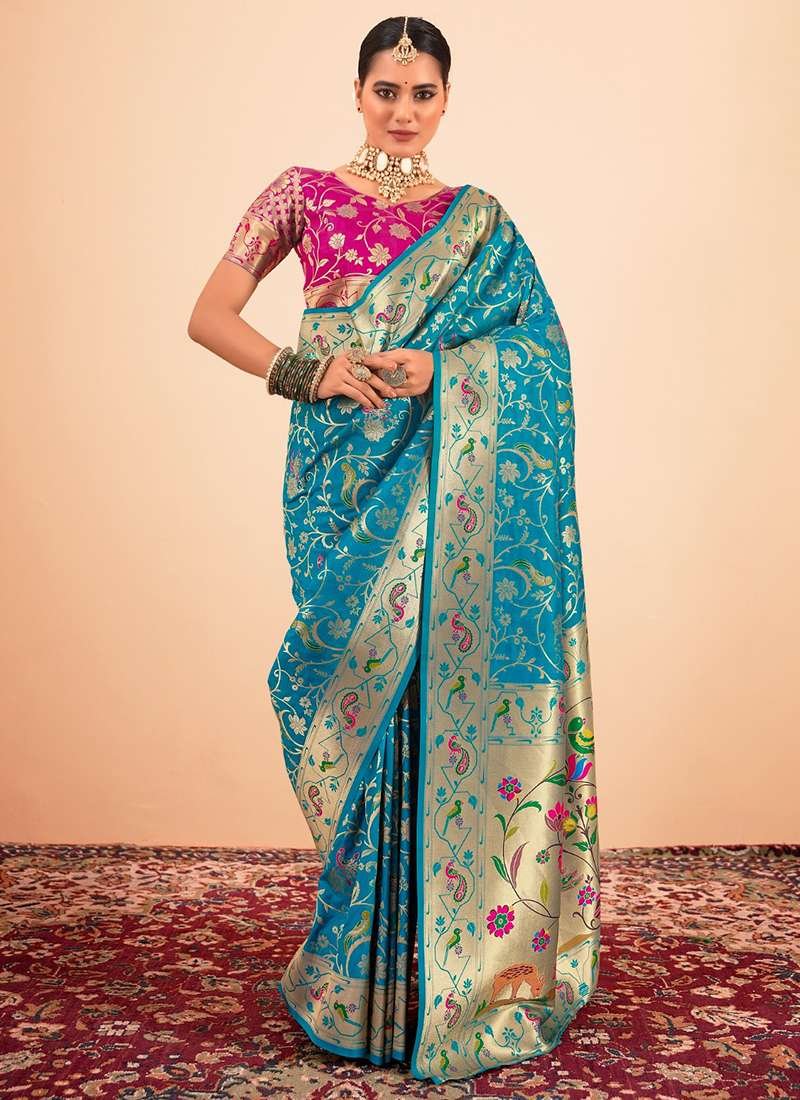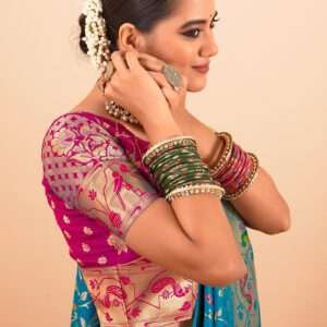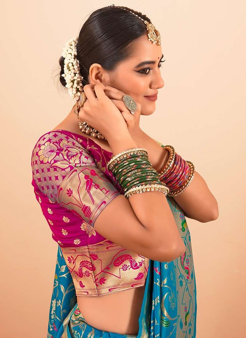 Indulge in the exquisite beauty of the Paithani Silk Firozi Festival Wear Weaving Saree, a masterpiece that embodies the timeless allure of Indian craftsmanship. Crafted from the finest paithani silk, this ethereal saree drapes gracefully, its rich firozi hue radiating elegance and sophistication. The intricate weaving adorns the saree with intricate motifs, creating a symphony of colors and textures that captivates the senses. Perfect for festive occasions, this stunning saree invites you to step into a world of timeless charm and ethnic opulence. Note that accessories shown in the image are for presentation purposes only, and the length may vary slightly. Embrace the allure of tradition with the Paithani Silk Firozi Festival Wear Weaving Saree, a testament to the enduring allure of Indian artistry.