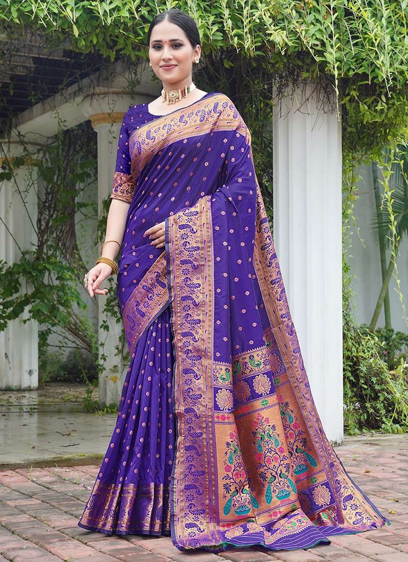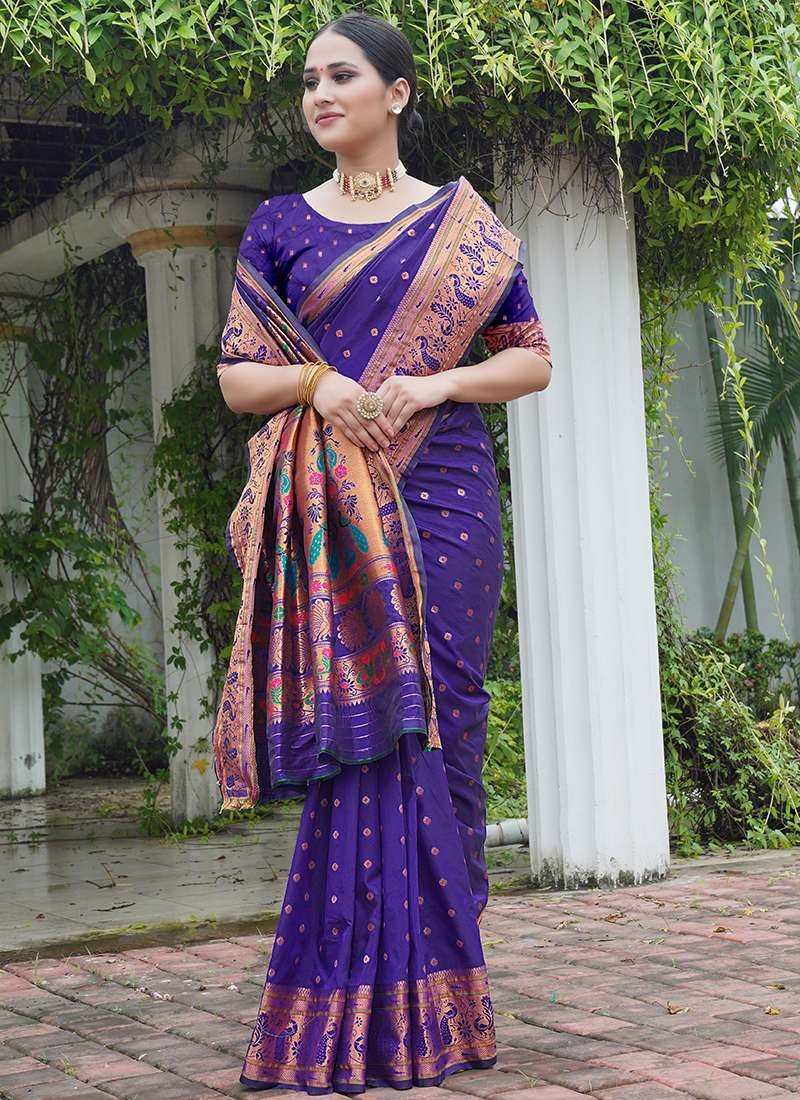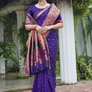 Immerse yourself in the captivating allure of this exquisite Paithani Silk Purple Festival Wear Weaving Saree. Crafted from opulent paithani silk, this exquisite drape exudes regal charm, adorned with intricate weaving that adds a touch of traditional artistry. Its rich purple hue evokes royalty, perfect for making a grand statement at any festive occasion. The saree’s delicate fabric and intricate craftsmanship ensure both comfort and elegance, while its versatile design allows for effortless styling to match your unique taste. Whether you choose to accessorize it with opulent jewelry or keep the focus on its timeless beauty, this Paithani Silk Purple Festival Wear Weaving Saree is sure to leave an unforgettable impression.