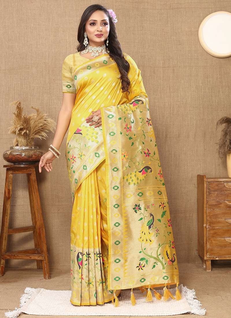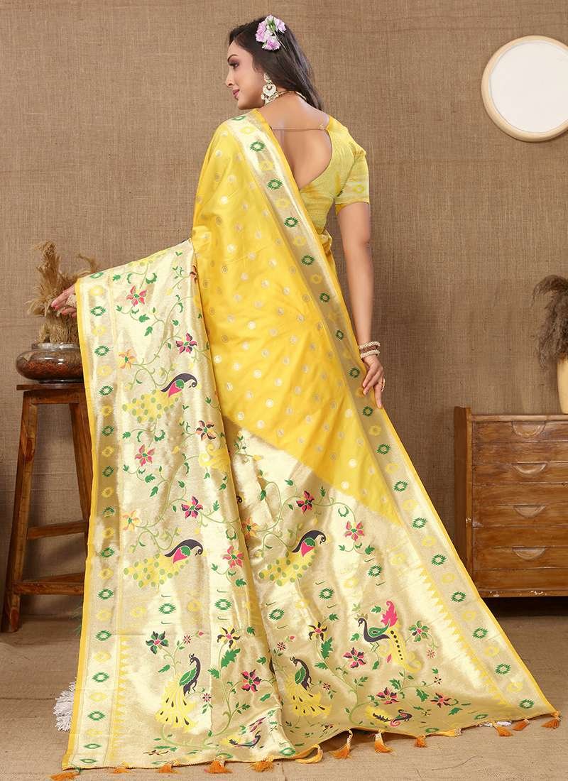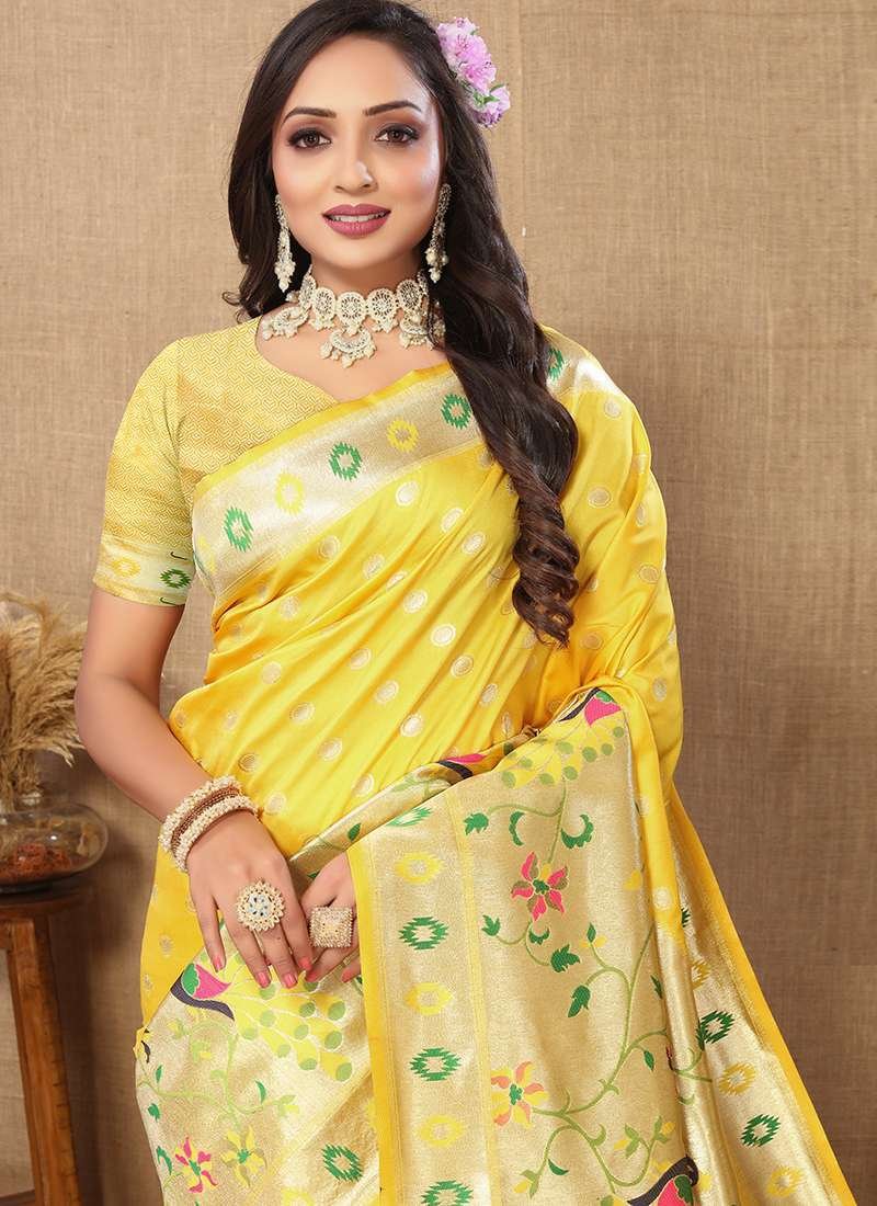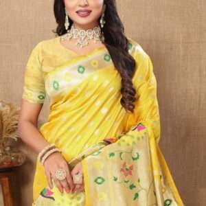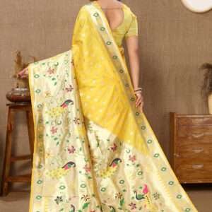 Indulge in the timeless elegance of our Silk Yellow Traditional Wear Paithani Saree, a masterpiece of Indian craftsmanship. Woven with the finest silk, this exquisite garment envelops you in a vibrant shade of yellow. Its intricate paithani work adorns the saree, creating a mesmerizing tapestry that captures the essence of traditional Indian artistry. The saree’s airy fabric drapes beautifully, ensuring both comfort and a flattering silhouette. Whether gracing special occasions or adding a touch of cultural charm to your wardrobe, this Silk Yellow Traditional Wear Paithani Saree will undoubtedly become a cherished heirloom.